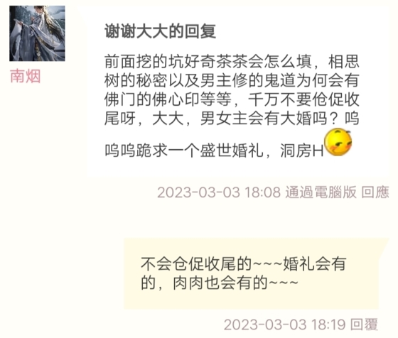 前面挖的坑好奇茶茶会怎么填,相思树的秘密以及男主修的鬼道为何会有佛门的佛心印等等,千万不要仓促收尾呀,大大男女主会有大婚吗?鸣鸣鸣跪求一个盛世婚礼,洞房H