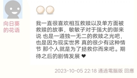 我一直很喜欢相互救赎以及单方面被救赎的故事,敏敏子对于强大的御来说也是一道独一无二的救赎之光吧,也是因为现实世界真的很少有这种情节,那个人就是为了拯救你而来吧。期待之后的剧情发展