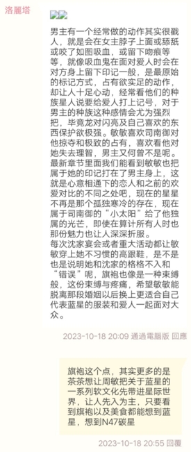 茶茶:旗袍这个点,其实更多的是茶茶想让周敏把关于蓝星的一系列软文化先带进星际世界,让人先入为主,只要看到旗袍以及美食都能想到蓝星,想到N47碳星