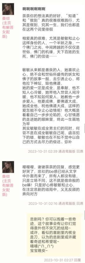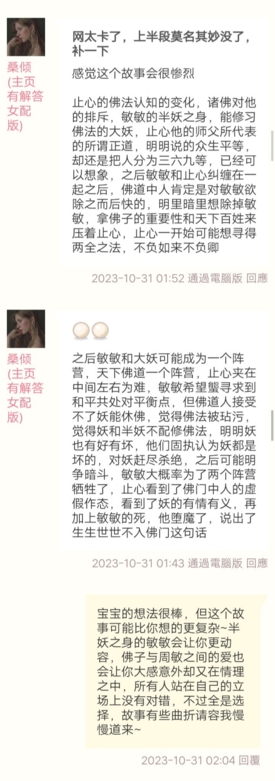桑倾:之后敏敏和大妖可能成为一个阵营,天下佛道一个阵营,止心夹在中间左右为难,敏敏希望能寻求到和平共处的平衡点,但佛道人接受不了妖能修佛,觉得佛法被玷污,觉得妖和半妖不配修佛法,明明妖也有好有坏,他们固执认为妖都是坏的对妖赶尽杀绝,之后可能明争暗斗,敏敏大概率为了两个阵营牺牲了,止心看到了佛门中人的虚假作态,看到了妖的有情有义,再加上敏敏的死,他堕魔了,说出了生生世世不入佛门这句话